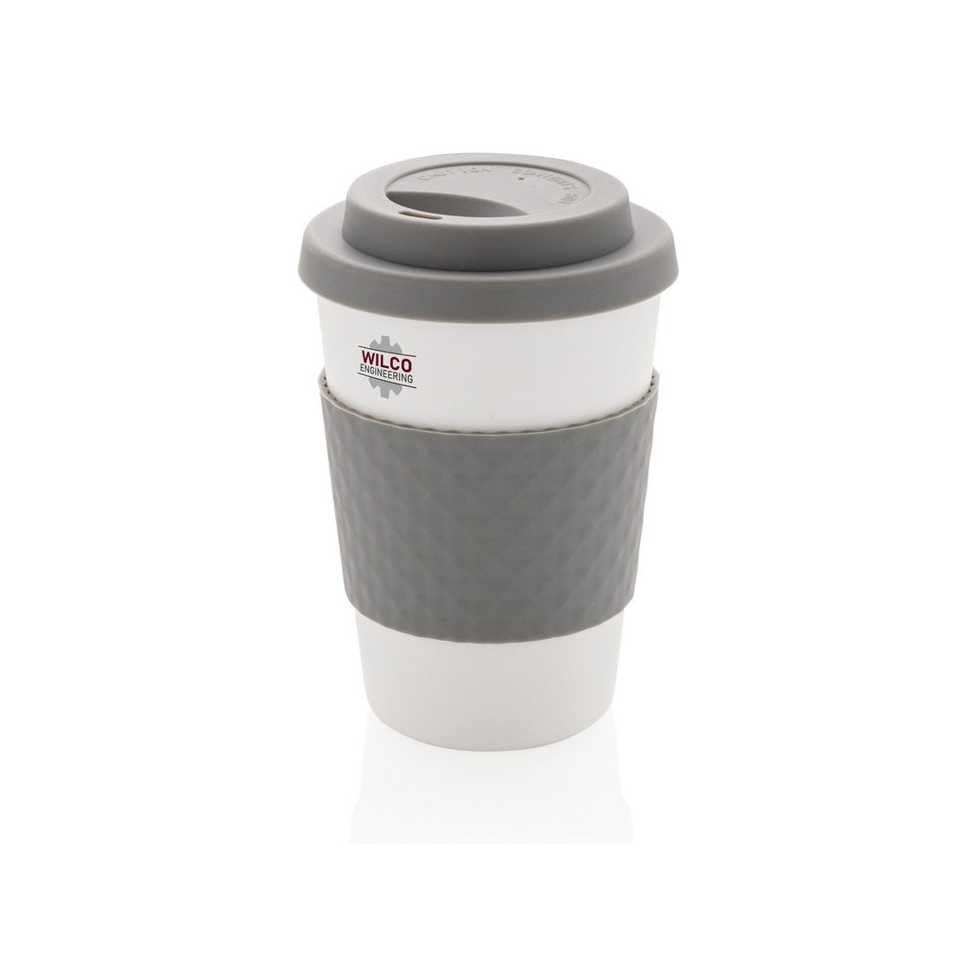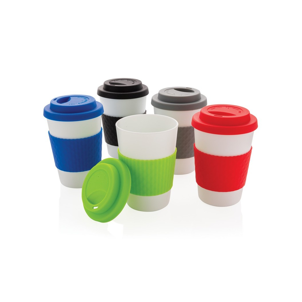 Kubki ekologiczne z logo firmy to znakomity gadżet reklamowy. Jest to także przydatny produkt podczas podróży. Kubki o pojemności 270 ml idealnie nadają się do wypicia pysznej kawy lub smakowej herbaty. Posiadają silikonowy uchwyt, który chroni przed poparzeniem. Dodatkowo kubki wyposażone są w wieczka, które zabezpieczają przed rozlaniem. Kubki ekologiczne z nadrukiem mogą być myte w zmywarce. Wykonane zostały z materiałów podlegających w 100% recyklingowi. Wielkość kubka pasuje do większości ekspresów do kawy.