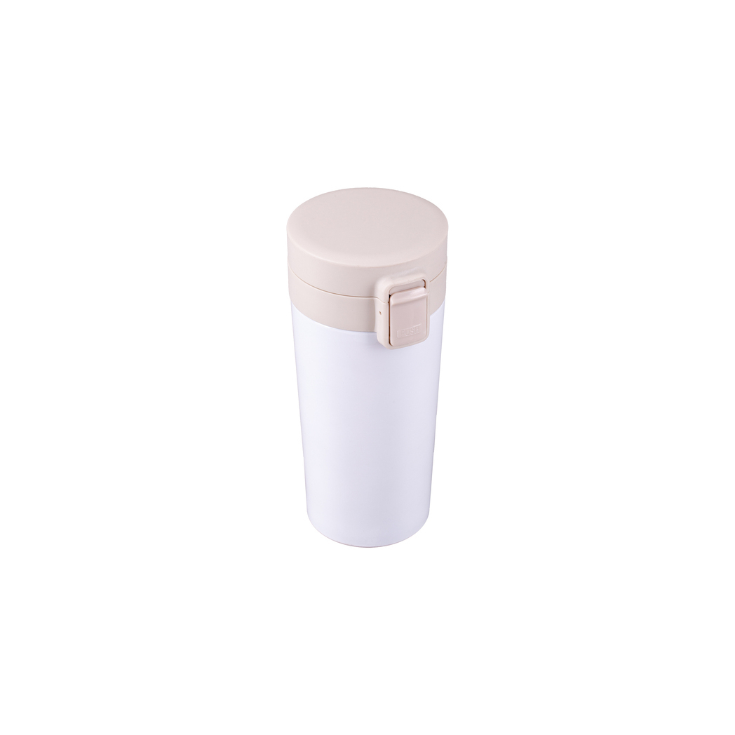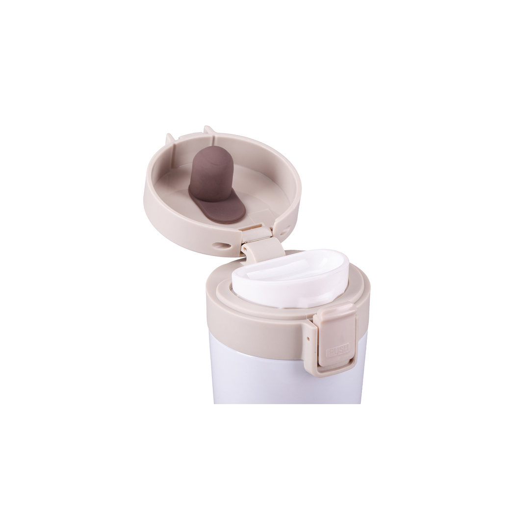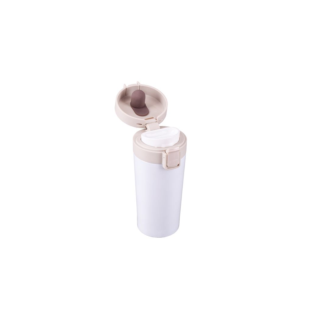 Biały kubek termiczny z nadrukiem wykonywanym na zamówienie to świetna opcja gadżetu reklamowego dla Twojej firmy. Podwójnie zabezpieczone przed przeciekaniem wieczko z wygodnym przyciskiem open/close oraz izolacja próżniowa, zapewniająca zachowanie wysokiej temperatury napoju do 10 godzin, gwarantują wygodę użytkowania. Praktyczny kubek termiczny z logo firmy sprawi, że klienci pozytywnie zapamiętają Twoją firmę. Kubek termiczny z własnym nadrukiem UV full color to również dobry dodatek do wyposażenia pracownika.