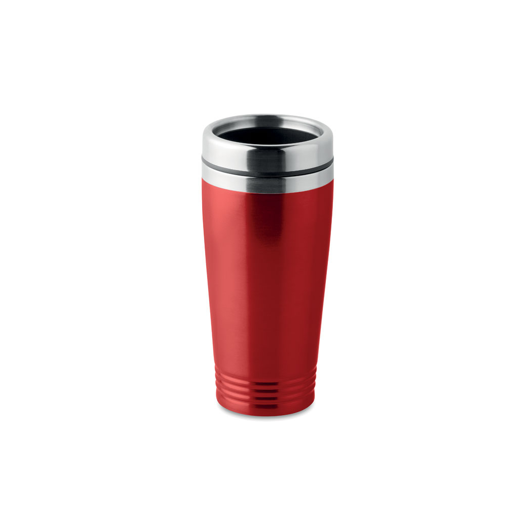Kubek termiczny z logo w kolorze czerwieni wykonany ze stali nierdzewnej idealnie będzie trzymał temperaturę gorących napojów.