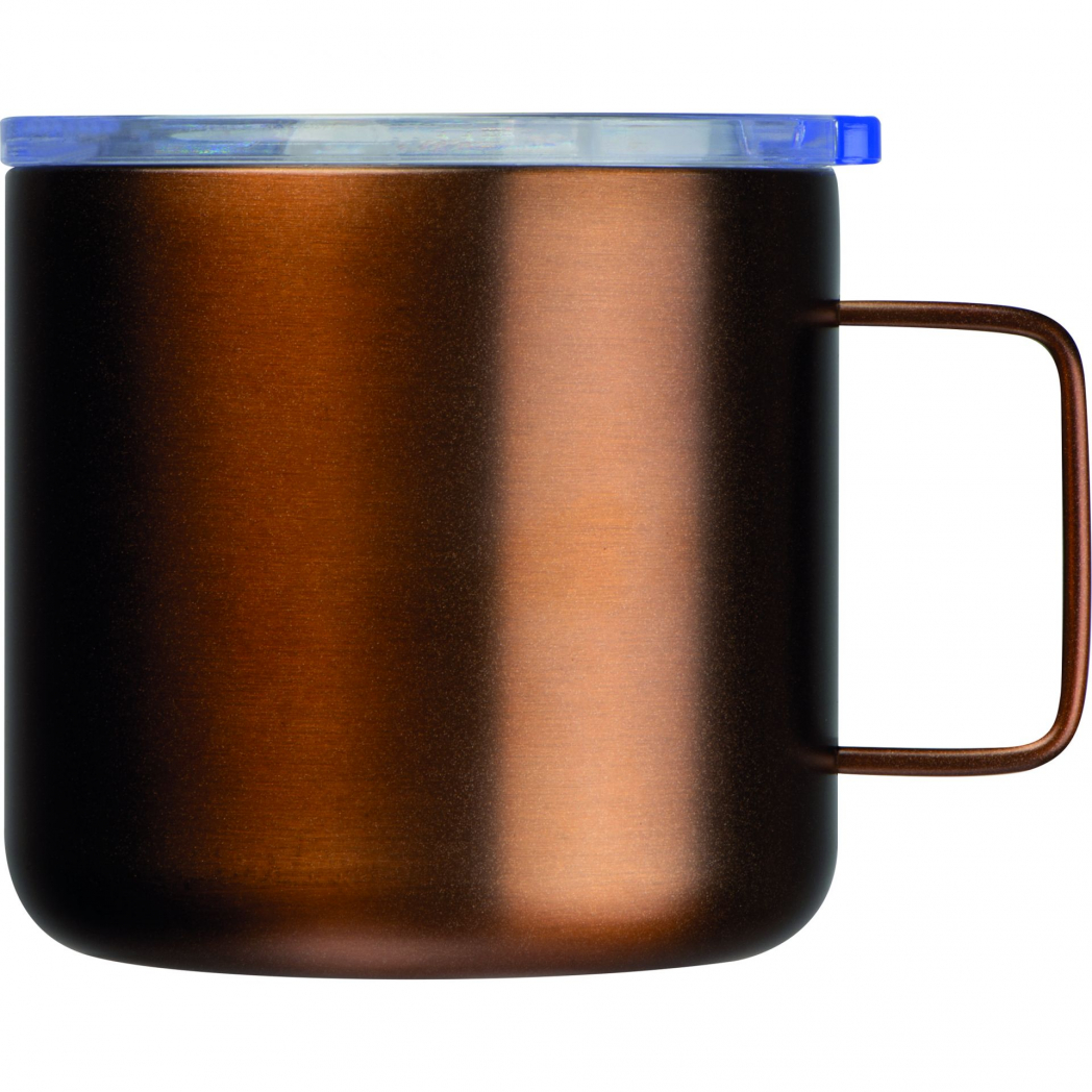 Kubek o podwójnych ściankach (izolacja próżniowa) ze stali nierdzewnej, z plastikową pokrywką.