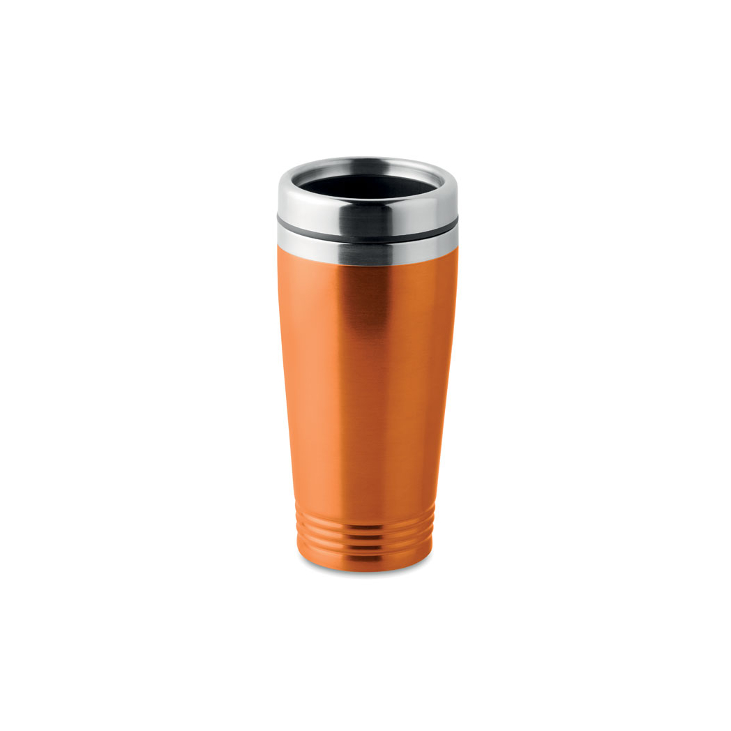 Kubek podróżny ze stali nierdzewnej z podwójnymi ściankami, z czarną pokrywką z PP.